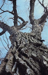 The smooth upper bark and deeply furrowed lower sections of cottonwood, signaling an early successional forest with a recent history of disturbance.